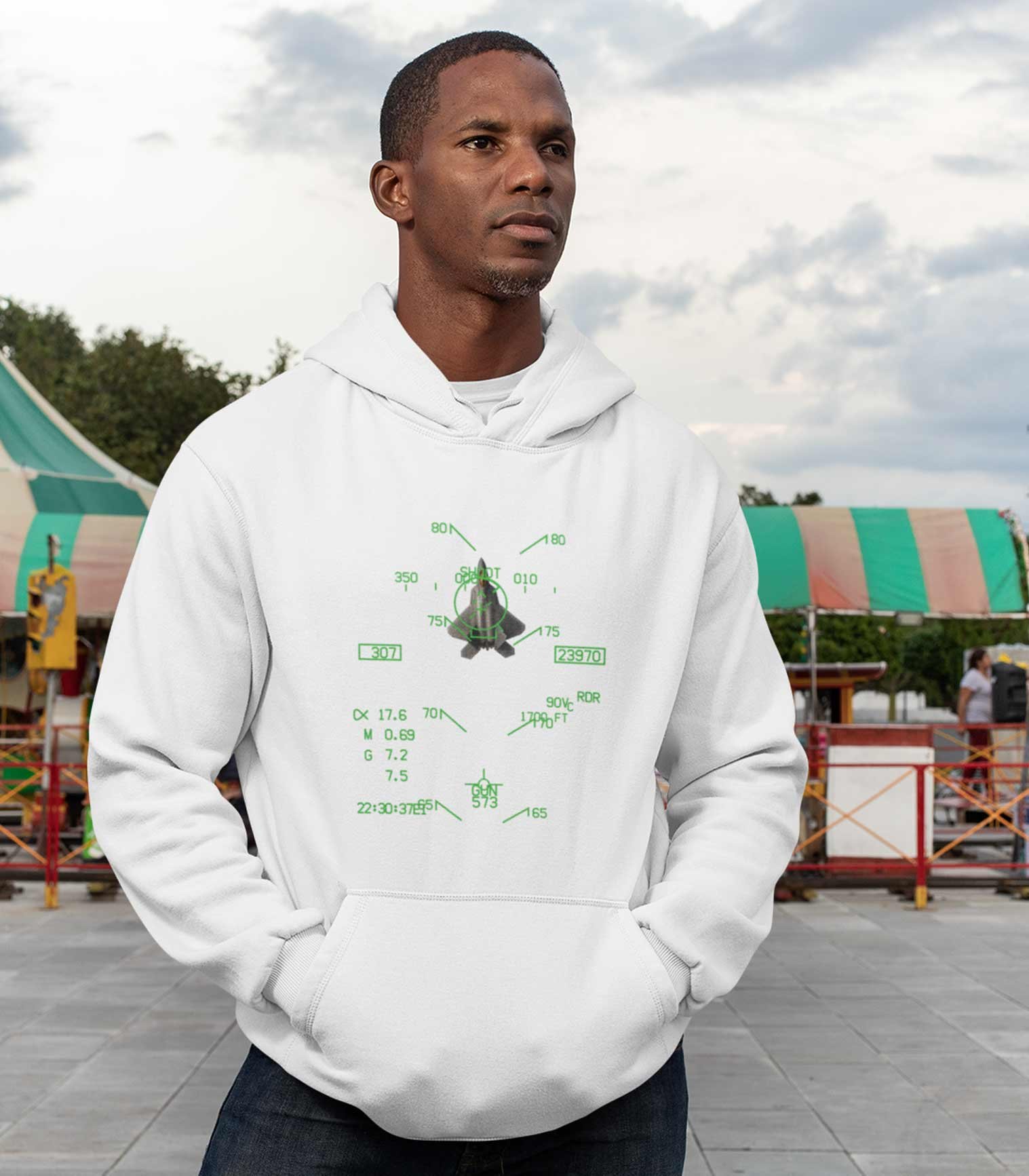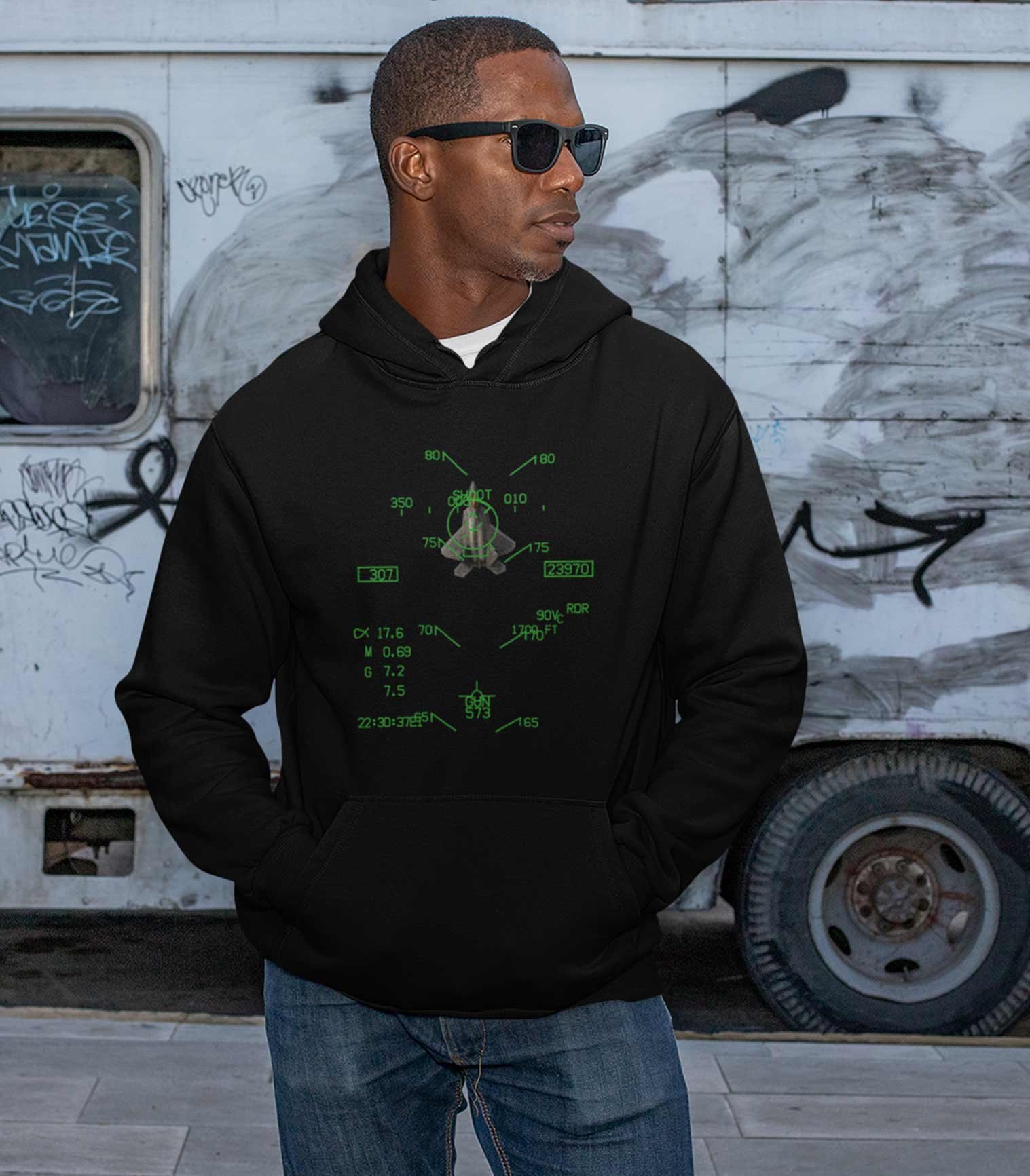 This hoodie replicates the exact Heads-Up Display (HUD) symbology seen through a pilot’s visor — where altitude, speed, radar, and targeting data merge into one futuristic overlay.