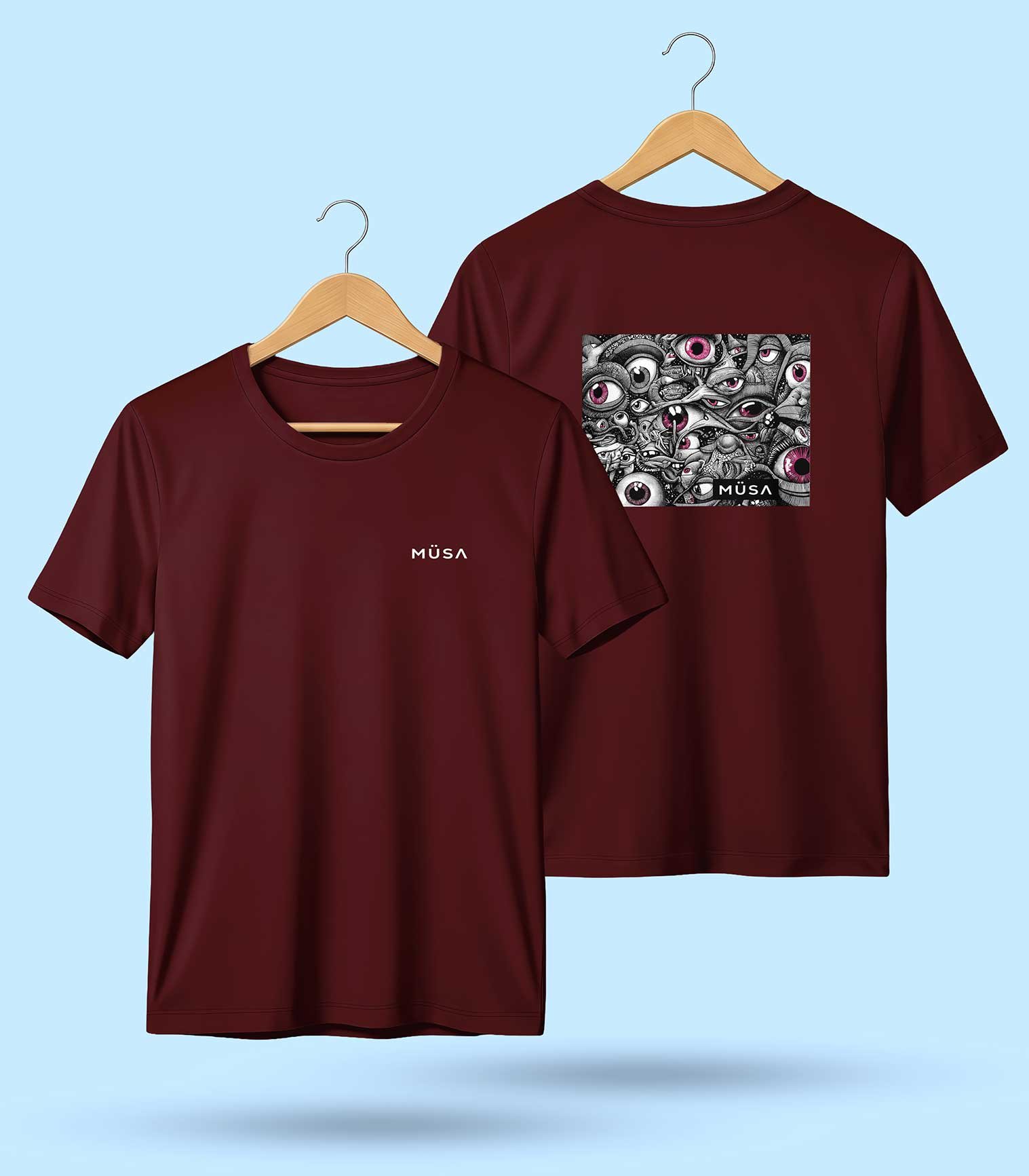 MUSA eyes is a metaphorical T-shirt, we have MUSA eyes a beautiful area in Egypt, but also the Eye symbol always has its strong impact, so you can say that you have many eyes at your back, OR many eyes on you. You choose!
